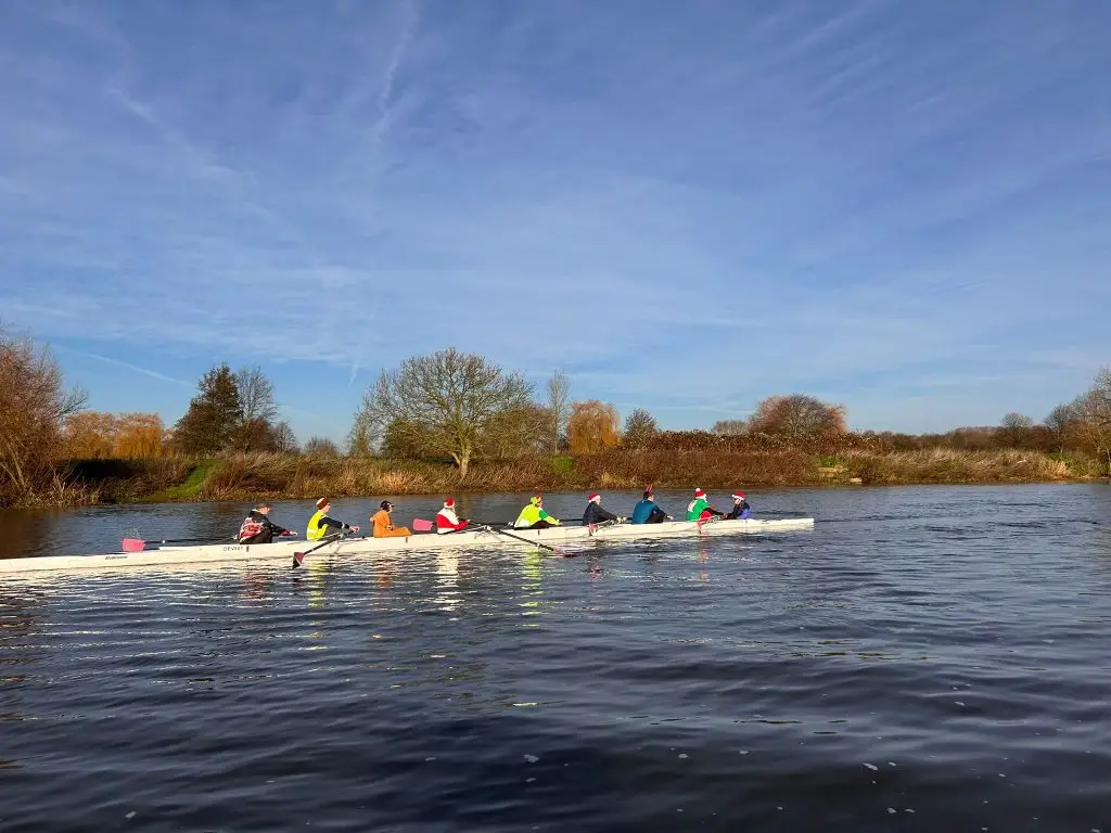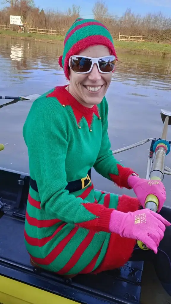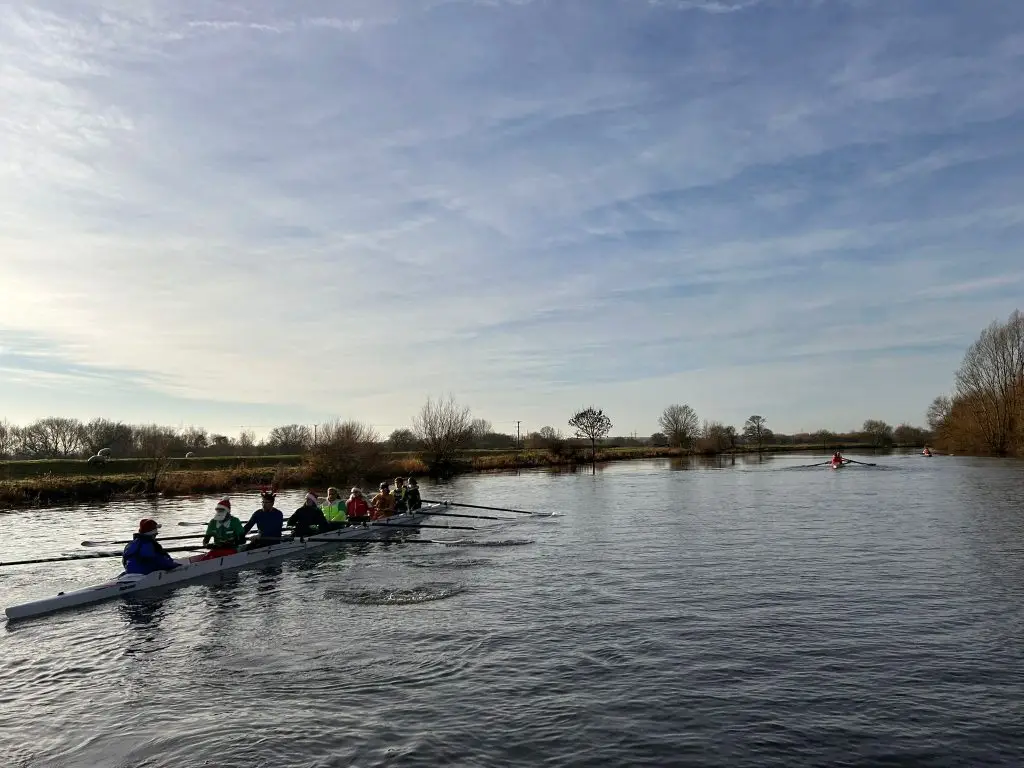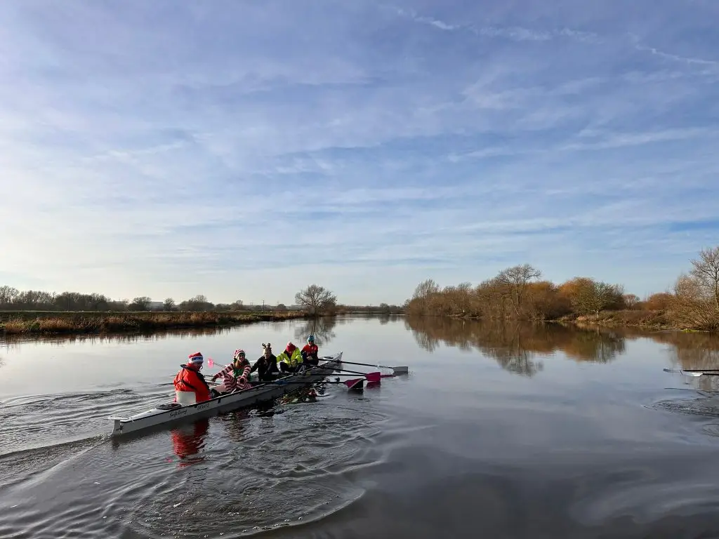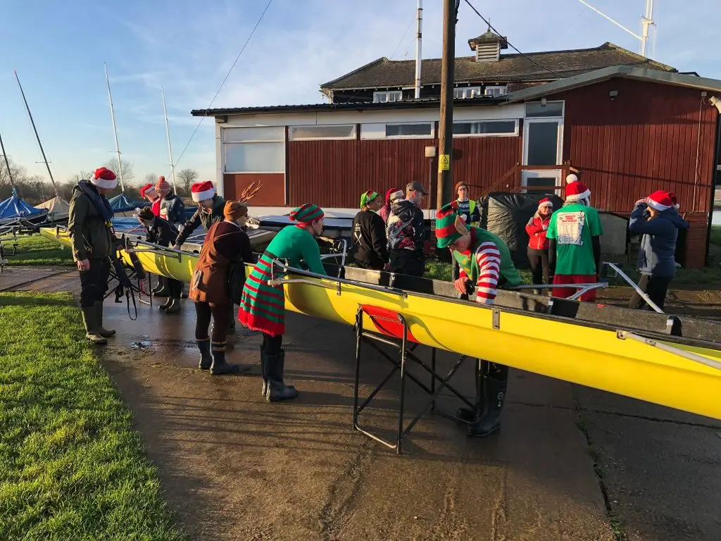 Lots of festive fun at Saturday’s Santa Row. Two eights, a quad , a double and the launch out on the flat, but fast water. The sun shone. A quick burst of activity out on the river and then back in for the great buffet prepared by John and Julie, the sailing club stewards. The hamper was won by lucky Caroline and the first, second and third prizes in the fancy dress went to Alfie, Di and Michelle. Of course, Laura’s reindeer was amazing, but she did win last year. Very well done to Jo for organising it all.