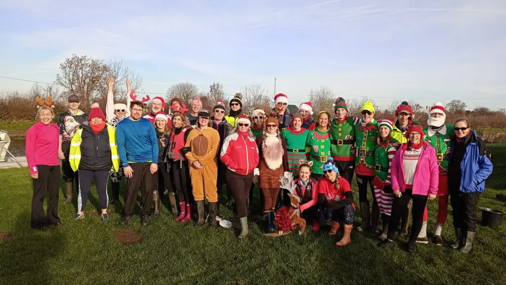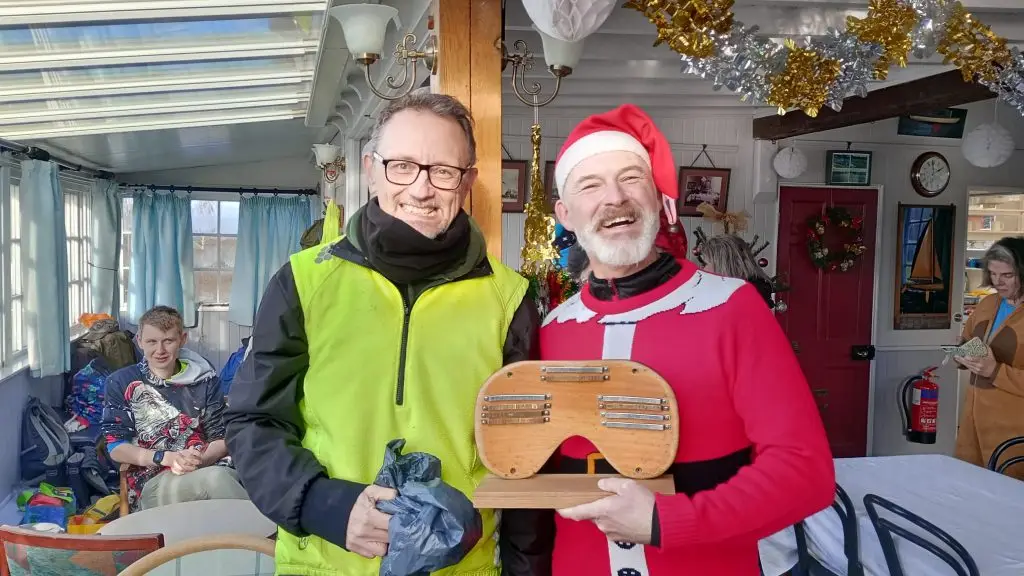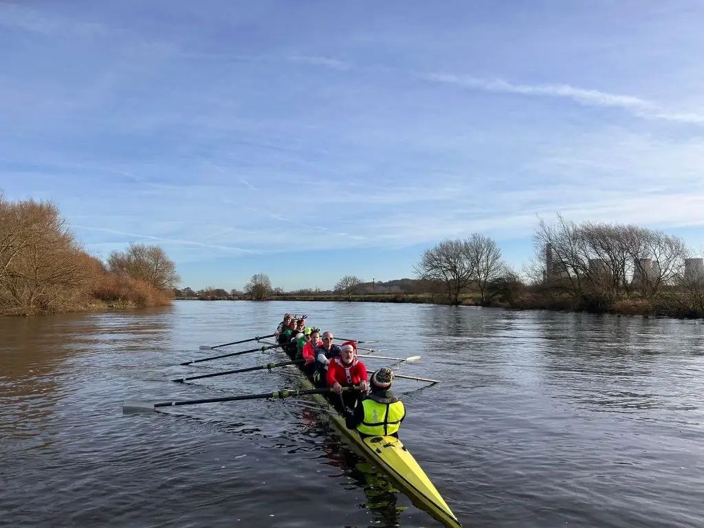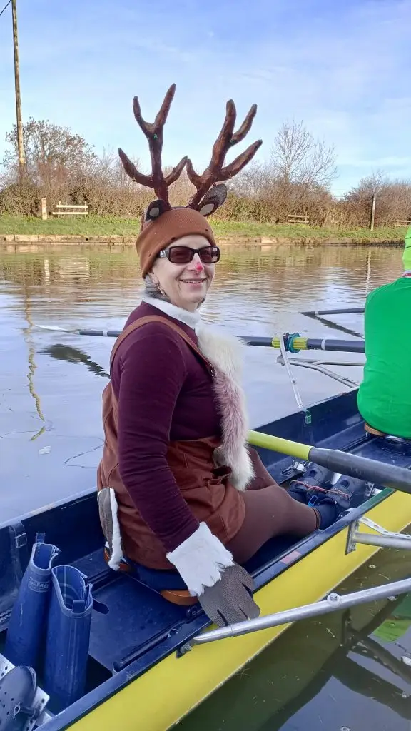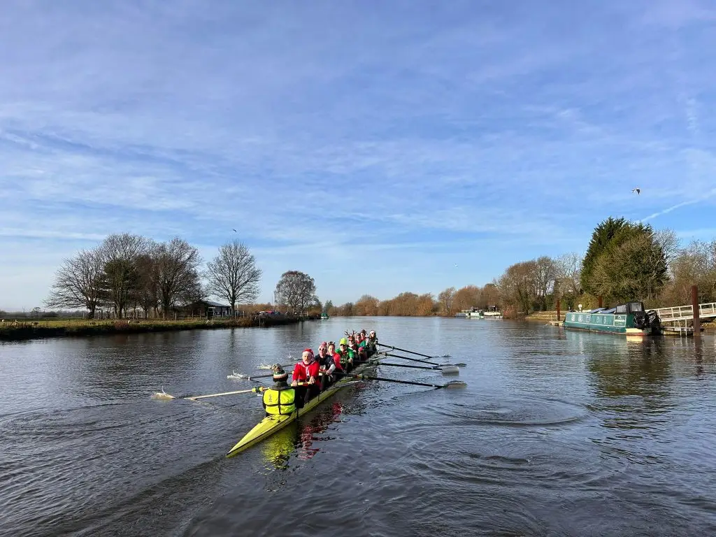 Lots of festive fun at Saturday’s Santa Row. Two eights, a quad , a double and the launch out on the flat, but fast water. The sun shone. A quick burst of activity out on the river and then back in for the great buffet prepared by John and Julie, the sailing club stewards. The hamper was won by lucky Caroline and the first, second and third prizes in the fancy dress went to Alfie, Di and Michelle. Of course, Laura’s reindeer was amazing, but she did win last year. Very well done to Jo for organising it all.